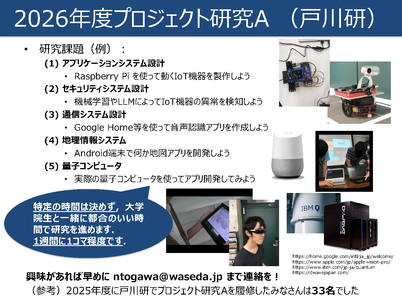 戸川と個別面談を希望する場合には ntogawa [at] waseda.jp ([at]を@に置き換えてください) にメールしてください.質問も歓迎です!